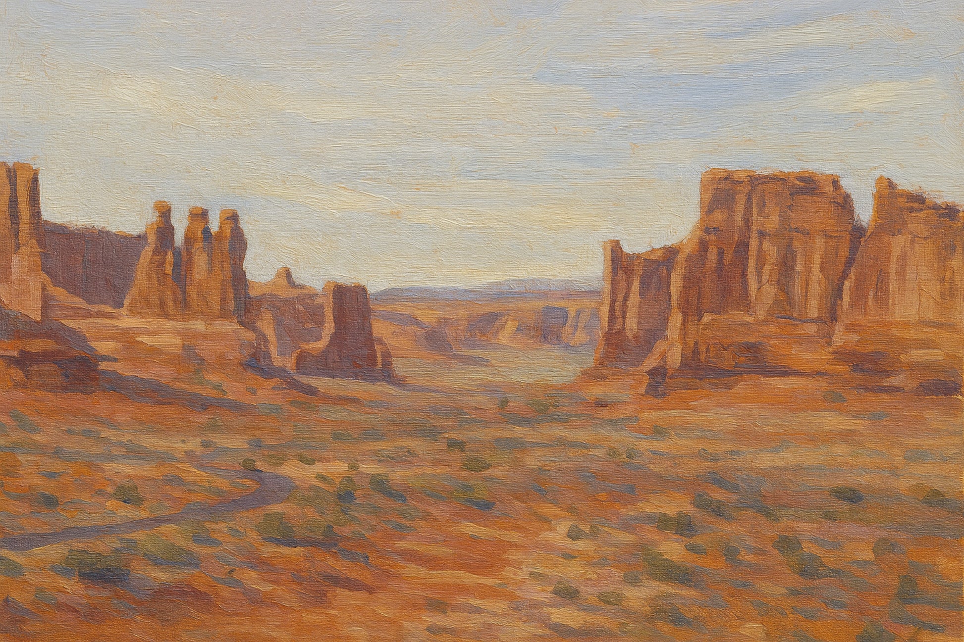 A sunlit road winding through Arches National Park, framed by red rock formations and a timeless Western desert landscape.