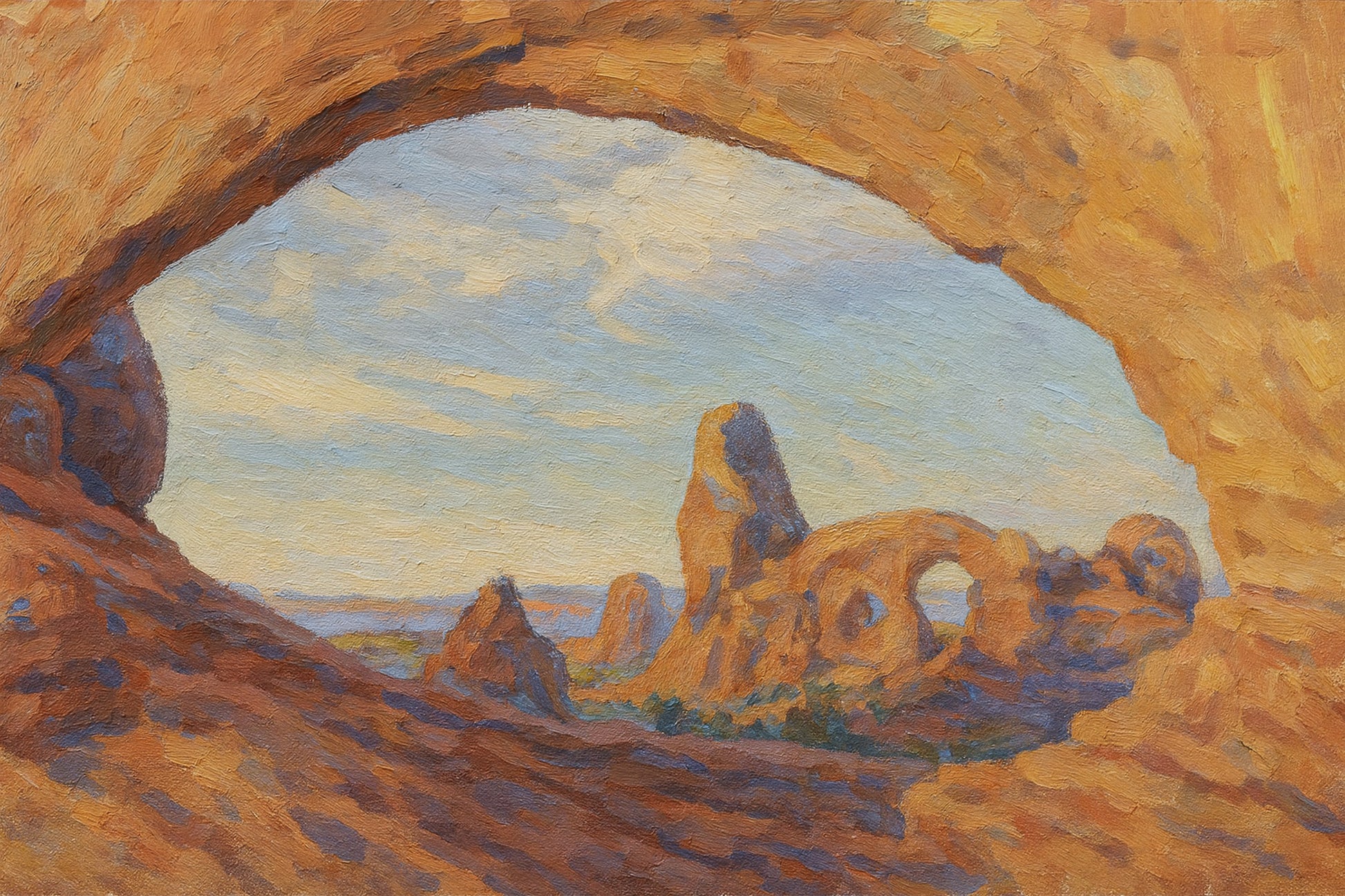 Turret Arch seen through the window of North Window in Arches National Park with the high desert under a soft, cloud-streaked sky. Painterly brushwork and a sun-washed palette of ochres and cool shadow violets give the scene depth, atmosphere, and that timeless Southwest feeling.