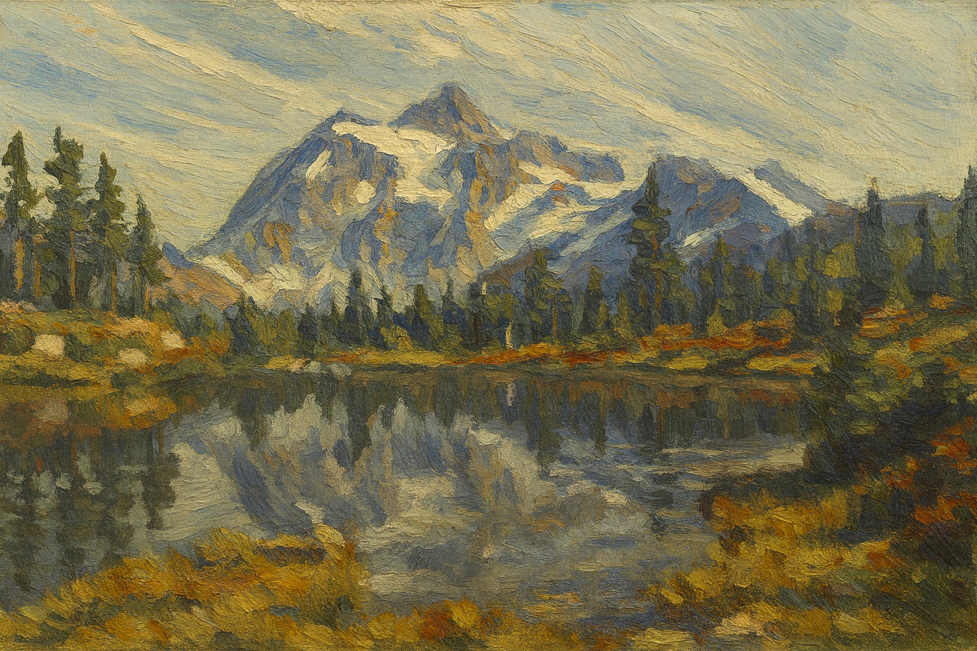 A jagged, snow-laced peak rises beyond a dark band of evergreens, its cool blue shadow planes broken by warm ochre highlights, while the still lake below mirrors the whole massif in a softly rippled reflection. In the foreground, autumny gold-and-rust brushwork suggests low shrubs and tundra grasses, giving the scene a crisp, high-country North Cascades feel under a pale, wind-streaked sky.