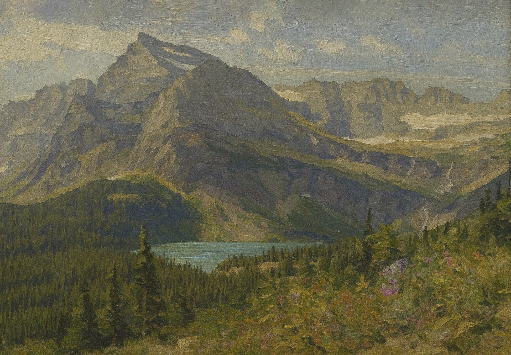 Grinnell Lake glows turquoise below the steep face of Angel Wing and Mount Gould as meltwater from Grinnell Glacier drops through Grinnell Falls, all painted with confident, blocky plane-changes in the granite, broken evergreen stipples, and a soft, scumbled sky.