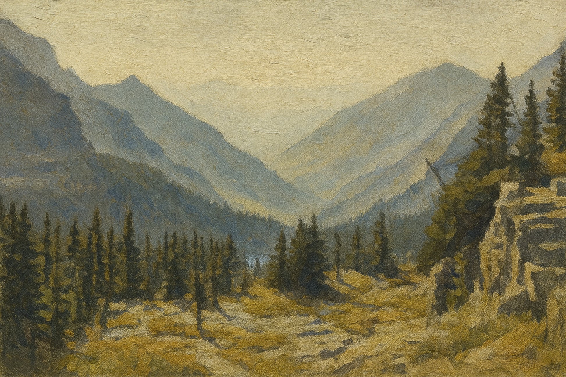 A golden mountain clearing on the Hidden Lake Trail opens between dark pines and distant blue silhouettes, painted with textured, dry-brush strokes that give the meadow and rocky outcrops a warm, weathered glow.