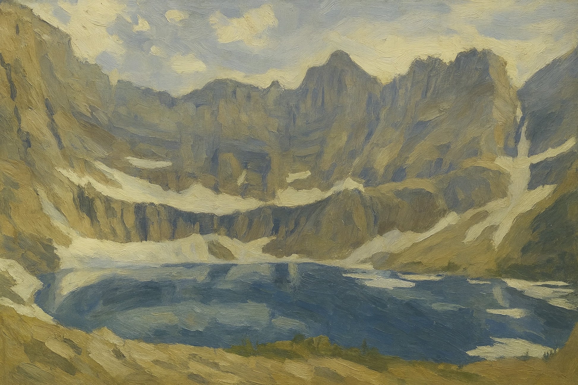 A cobalt alpine lake sits cradled beneath jagged, glacier-carved cirque walls, painted in broad planar strokes and gently broken brushwork that simplifies rock faces into crisp, luminous value shapes.