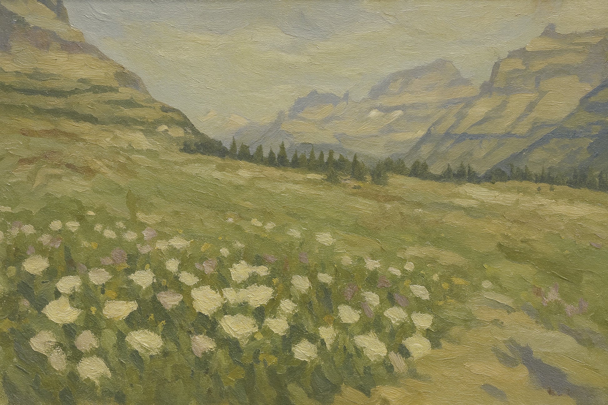 A carpet of wildflowers spreads across the Logan Pass alpine meadow on the Hidden Lake Trail, with layered Glacier peaks rising beyond the dark bands of spruce and fir under a wide, clear mountain sky. Painted with gentle, broken brushstrokes and muted greens and grays that create a calm, misty atmosphere.