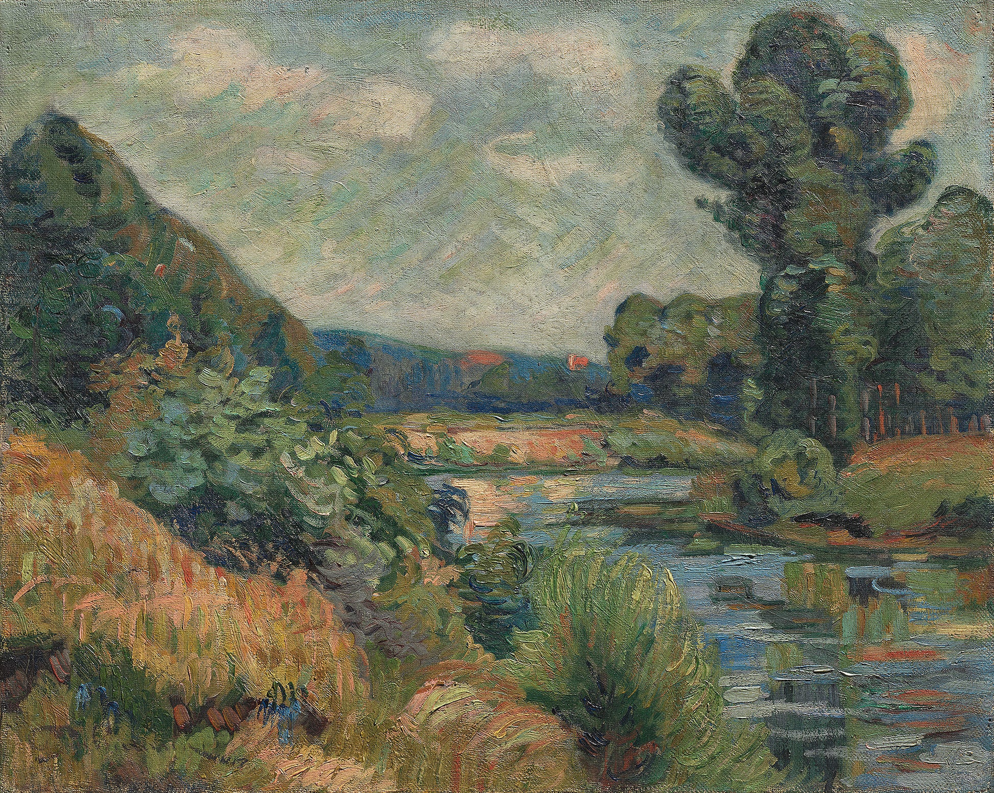 Guillaumin's oil renders the Marne riverbanks at Charenton in his Post-Impressionist style with bold, directional strokes and rich natural color.