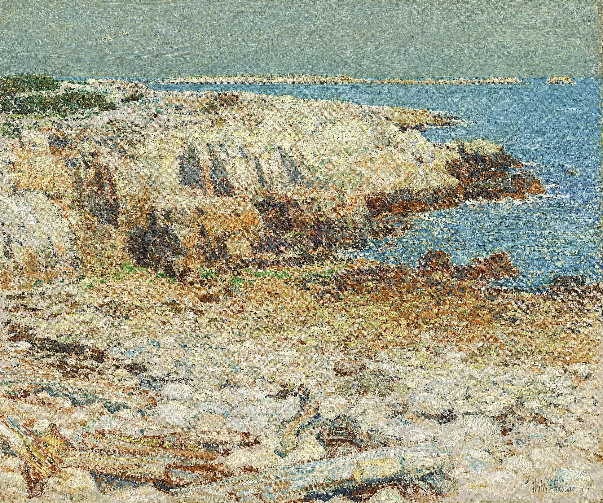 Hassam's oil captures a New England coastal headland in his broken, impressionistic style with cool sea light and bold, rocky forms.