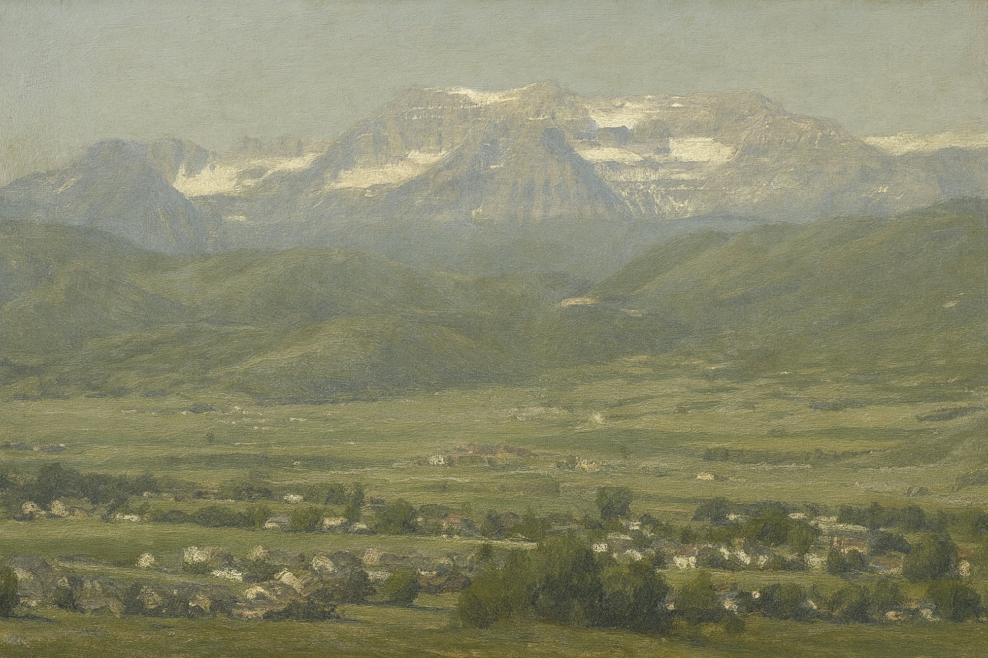 Mount Timpanogos rises in cool, misty layers above the rolling green foothills of Midway, Utah, where scattered country homes catch the soft light of the valley. Broad, painterly strokes and gentle scumbling keep the scene atmospheric—edges softened, colors harmonized, and the mountain’s snowfields suggested with quiet, textured highlights.