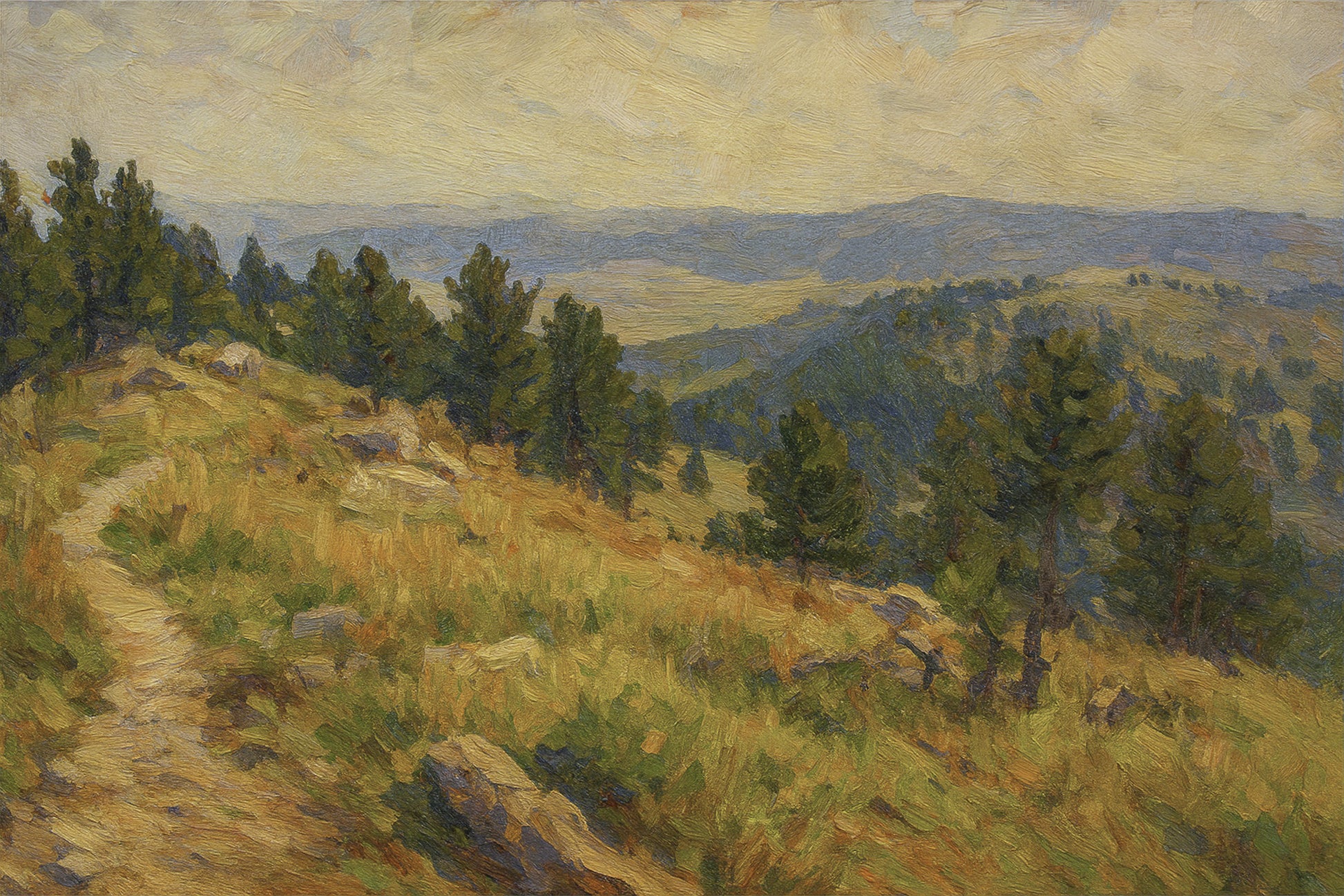 A sun-warmed grassy hillside trail winds past dark pines toward hazy rolling plains, painted with loose, textured brushstrokes that break the scene into soft, shimmering planes of color.
