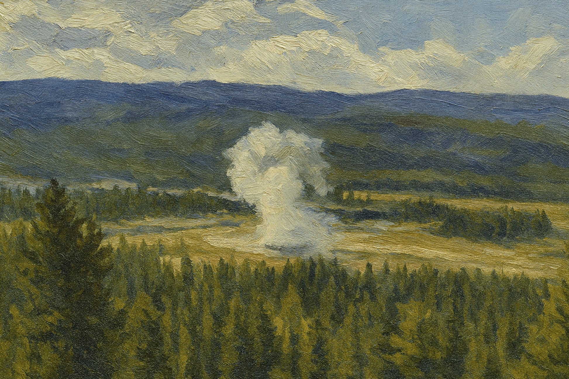 Old Faithful breathes a milky burst above Yellowstone’s forested basin and distant blue ridgelines, painted with crisp, directional strokes that stitch the pines into a textured tapestry and keep the steam soft and luminous against the sky.